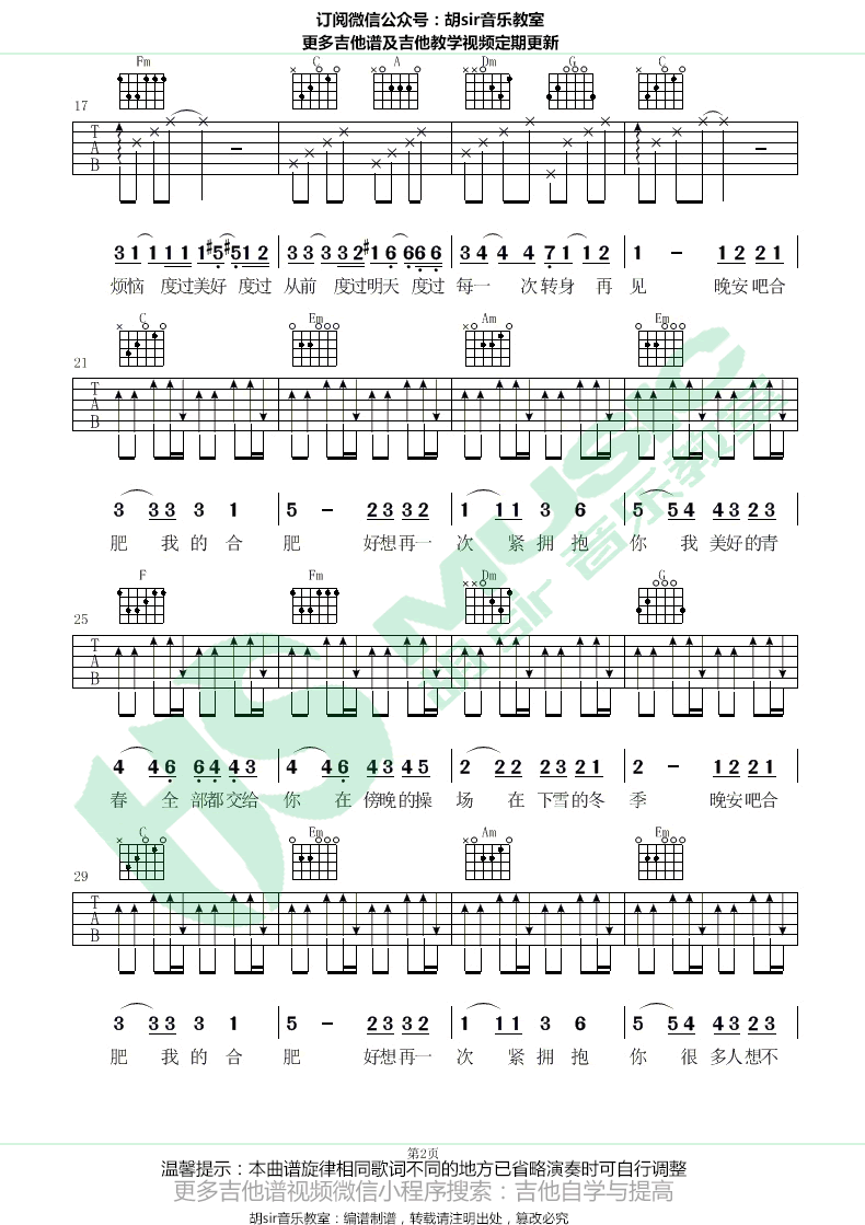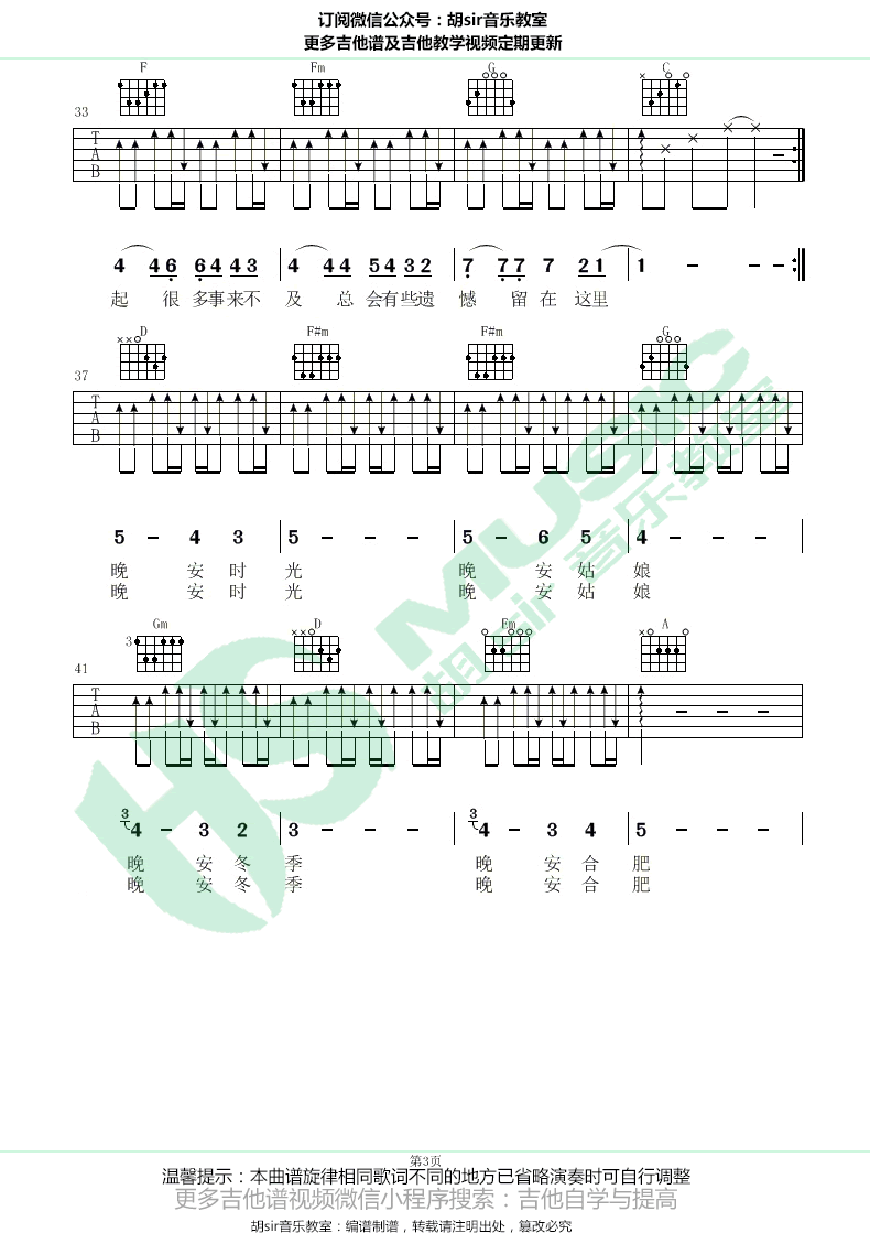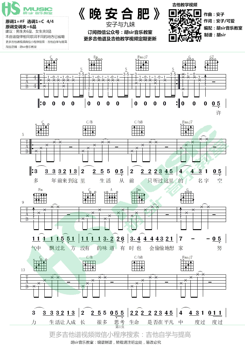 晚安合肥吉他谱 安子与九妹 C调弹唱谱 抖音歌曲 来源: 胡Sir 阅读 演唱 词曲:安子 晚安合肥吉他谱,安子与九妹演唱,原调#F,原调变调夹6品,选用C调指法,男生变调夹夹6品,《晚安合肥》六线谱,三张图片谱,胡Sir的编配,吉他吧更新,感谢吉他爱好者收藏分享。 这首歌来自萌芽于合工大的弹唱组合“安子与九妹”。曲风清新洒脱,琅琅上口,传递着正能量,那正好你的家乡是不是也正巧在合肥呢?如果不在,弹唱时也可以把城市名字替换成你正在居住的地方。 吉他吧版权所有,未经允许严禁转载!