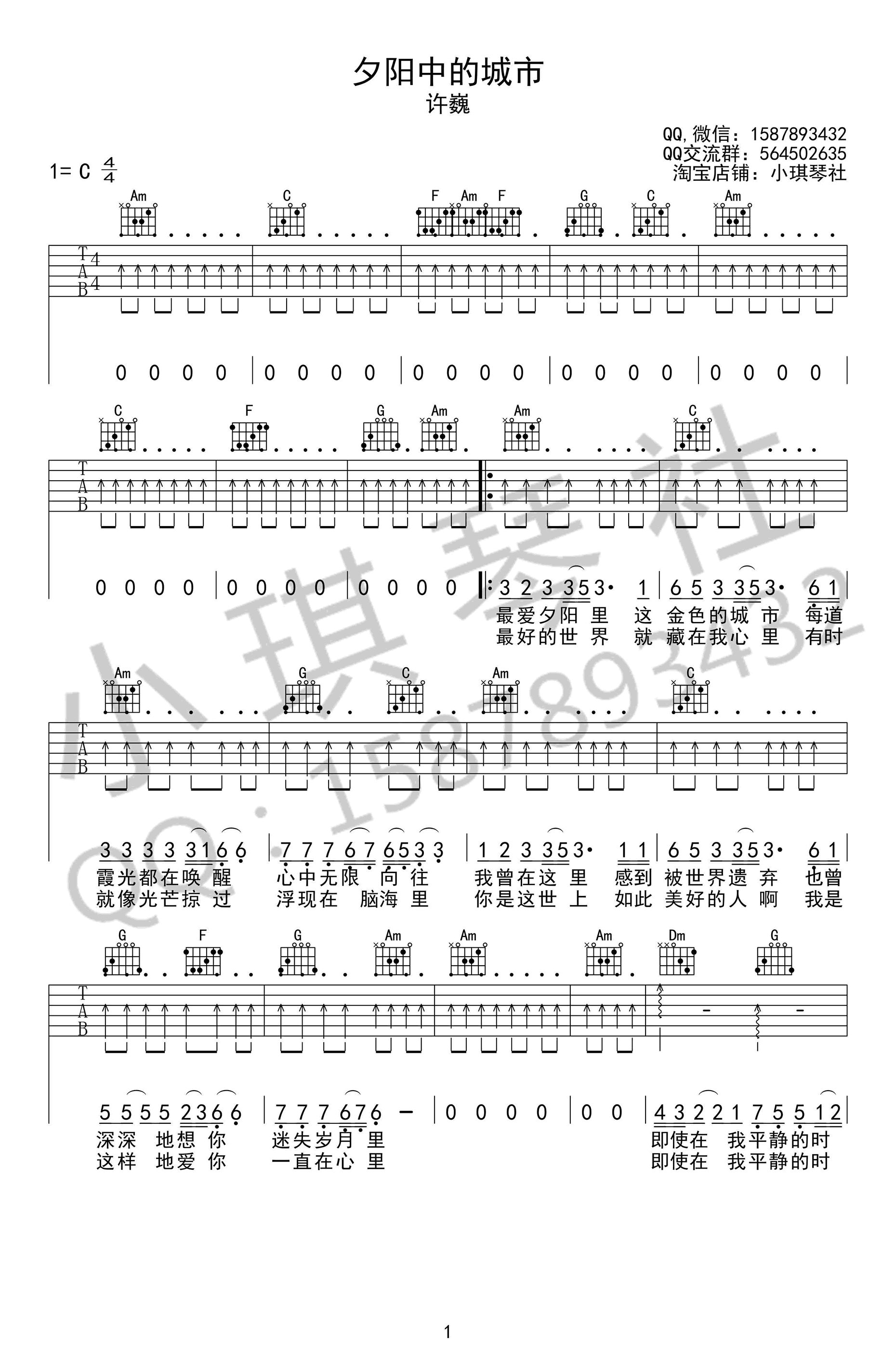 夕阳中的城市吉他谱_许巍_C调_弹唱六线谱 来源: 小琪琴社 阅读 演唱 词曲:许巍 《夕阳中的城市》吉他谱,许巍新专辑《无尽光芒》中的一首歌曲,夕阳中的城市六线谱,C调弹唱谱,高清图片谱,小琪琴社编配,吉他吧上传分享。 再质朴的文字,只要是用心写下并认真歌唱,便会动人!最爱夕阳里,这金色的城市。许巍用音乐讲述这人间冷暖,用旋律表达最真挚的情感,每句歌词每个音符,都分享着对生活的热爱。 吉他吧版权所有,未经允许严禁转载!